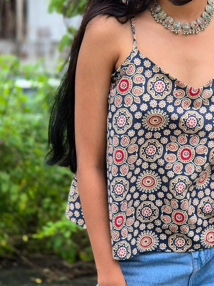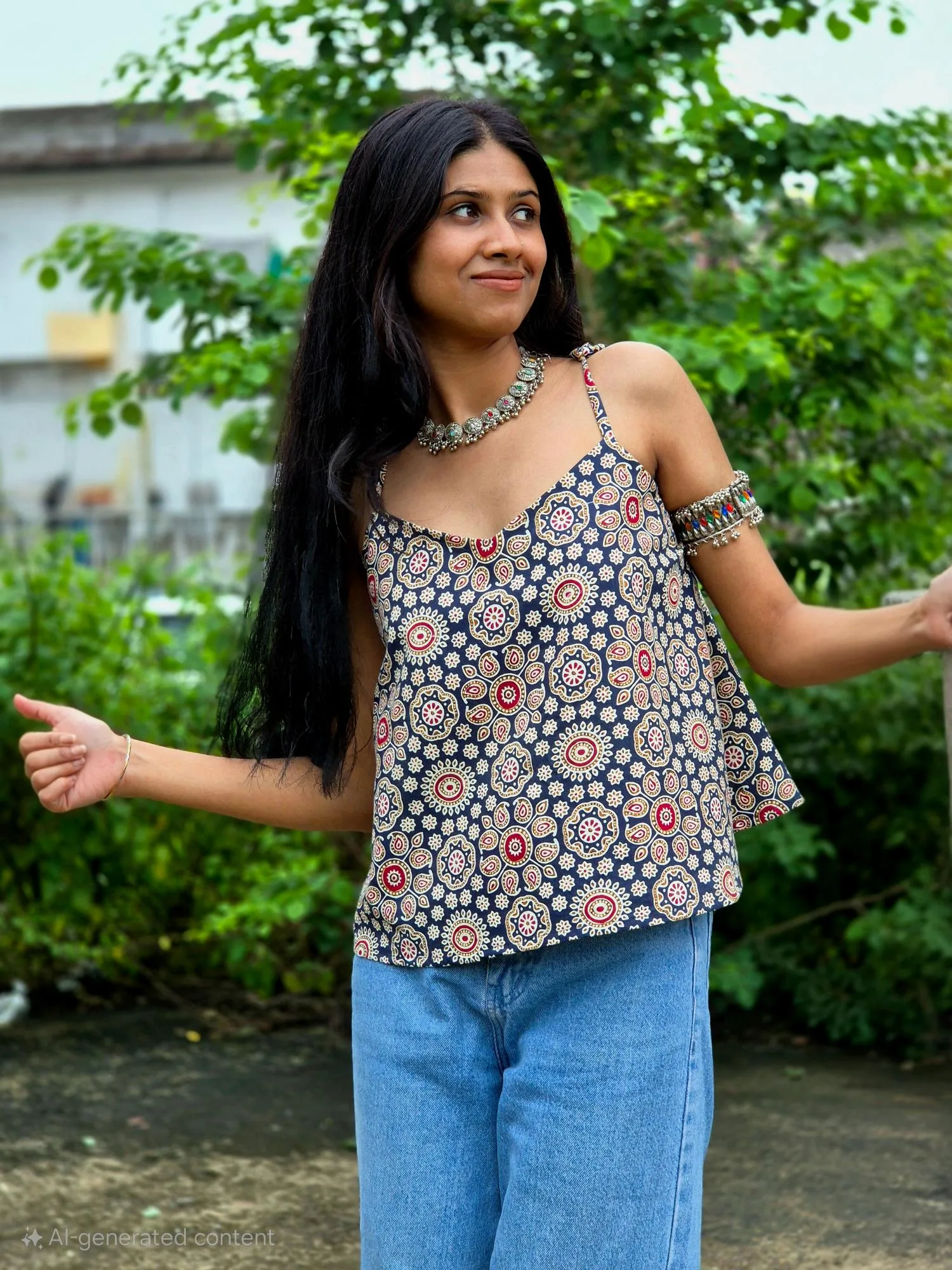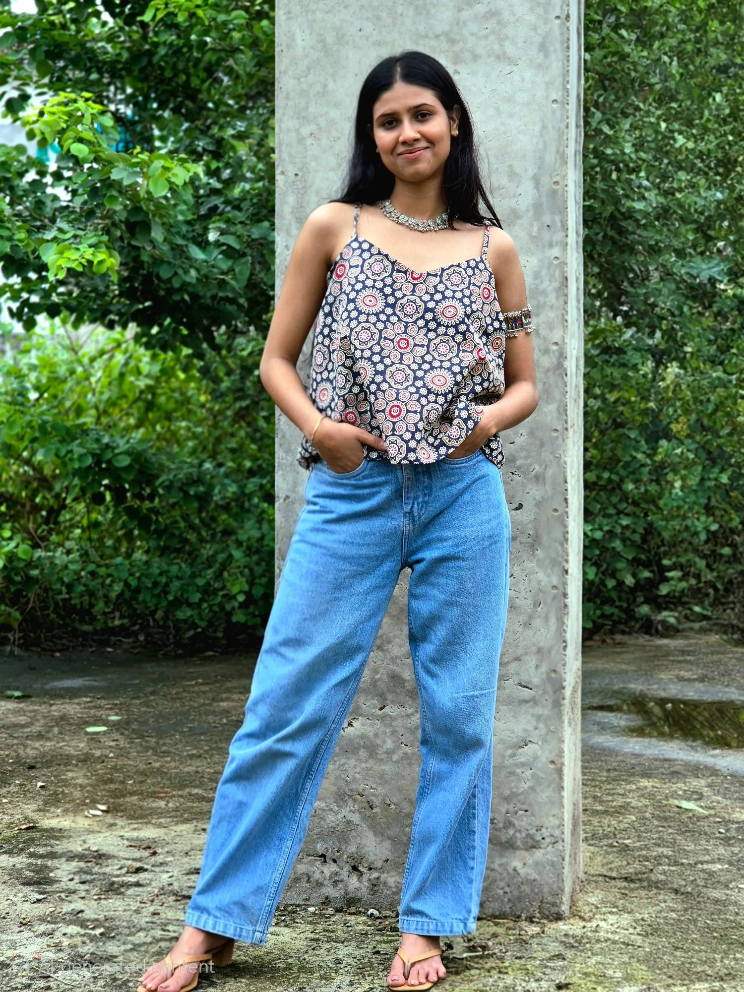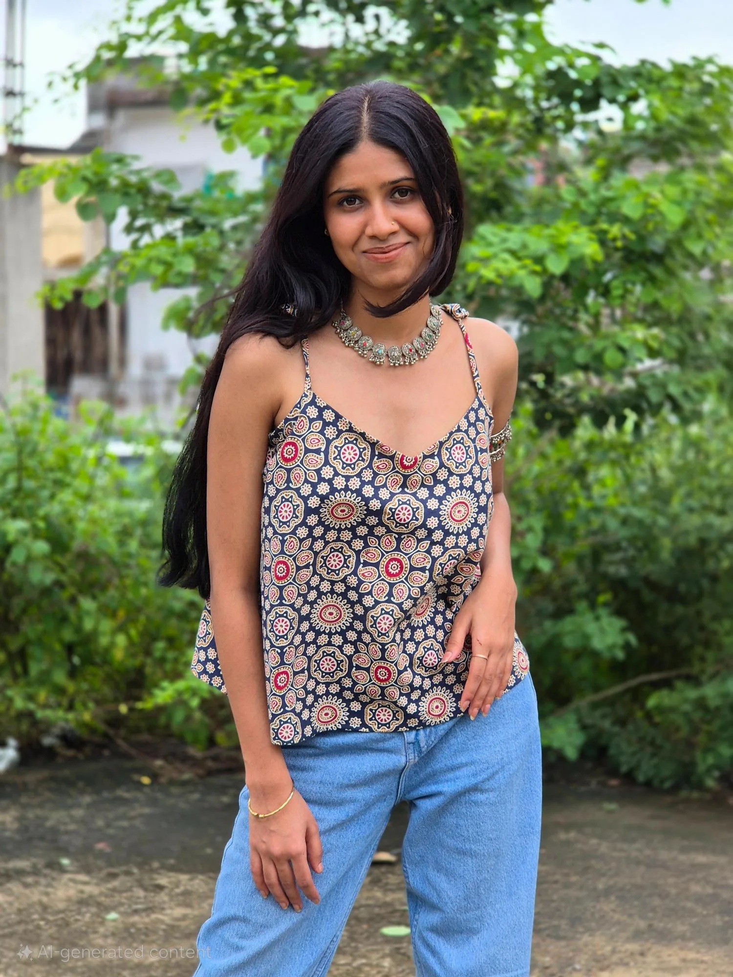 Add a vibrant touch to your everyday look with our Elegant Jaipuri Rangrez Cotton Top. Crafted in 100% pure cotton, this sleeveless strappy top is lightweight, breathable, and perfect for both summer and casual outings.