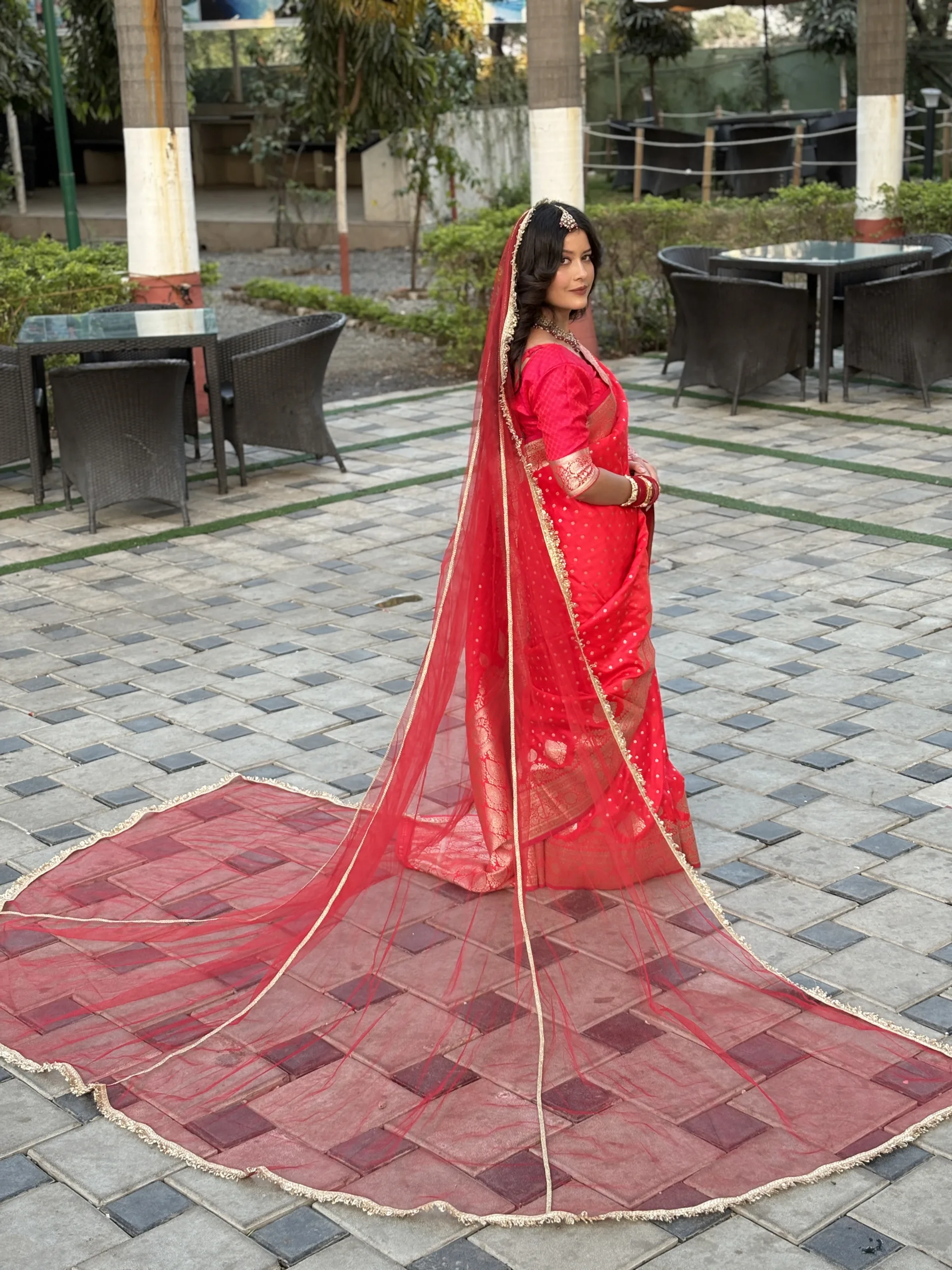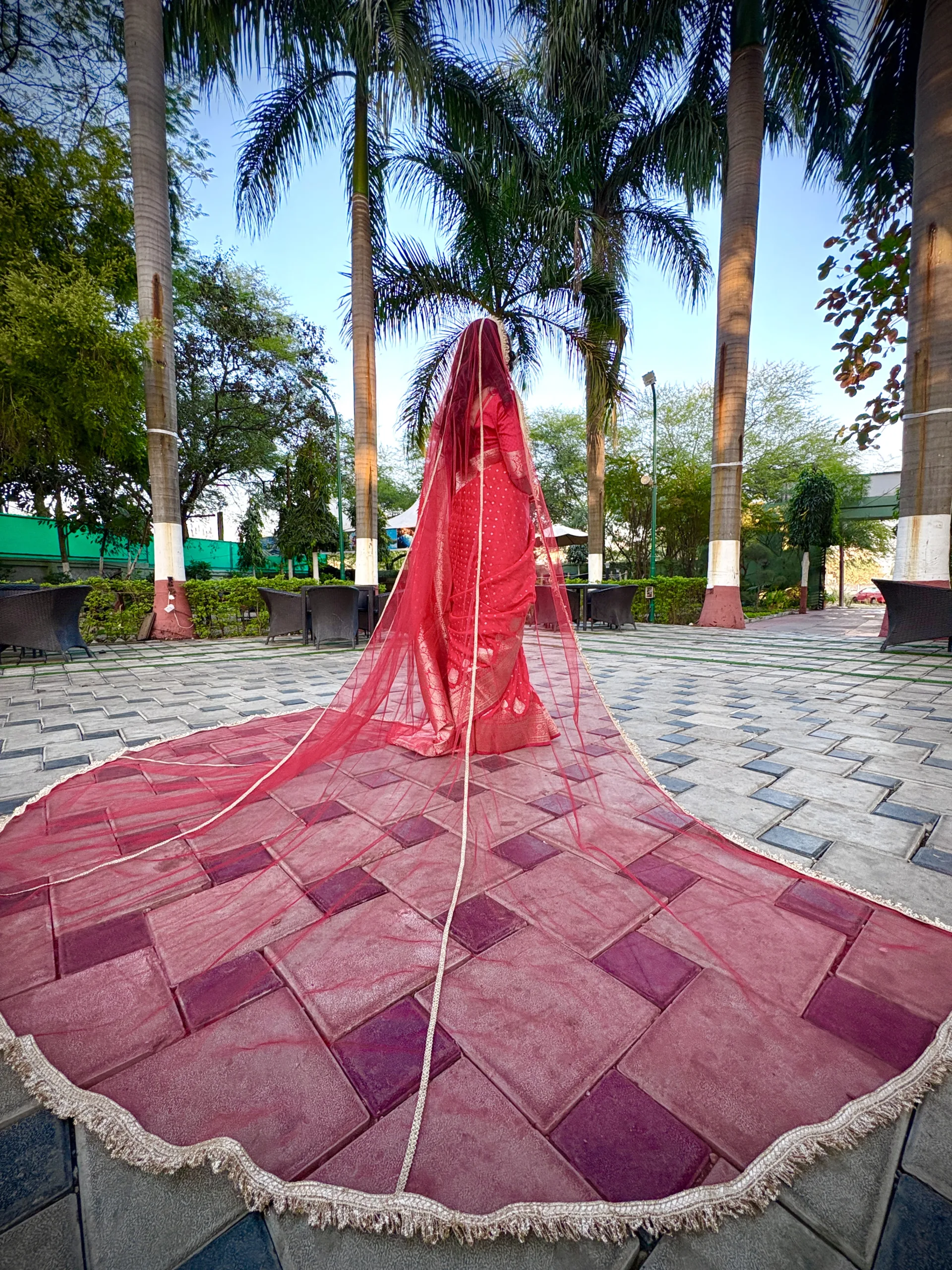 Step into your special day with grace and grandeur wearing this Luxury Red Bridal Net Veil, specially designed for a stunning bridal entry. Made from soft and transparent net fabric, this veil adds elegance without hiding the beauty of your bridal outfit, creating a flawless and refined look.