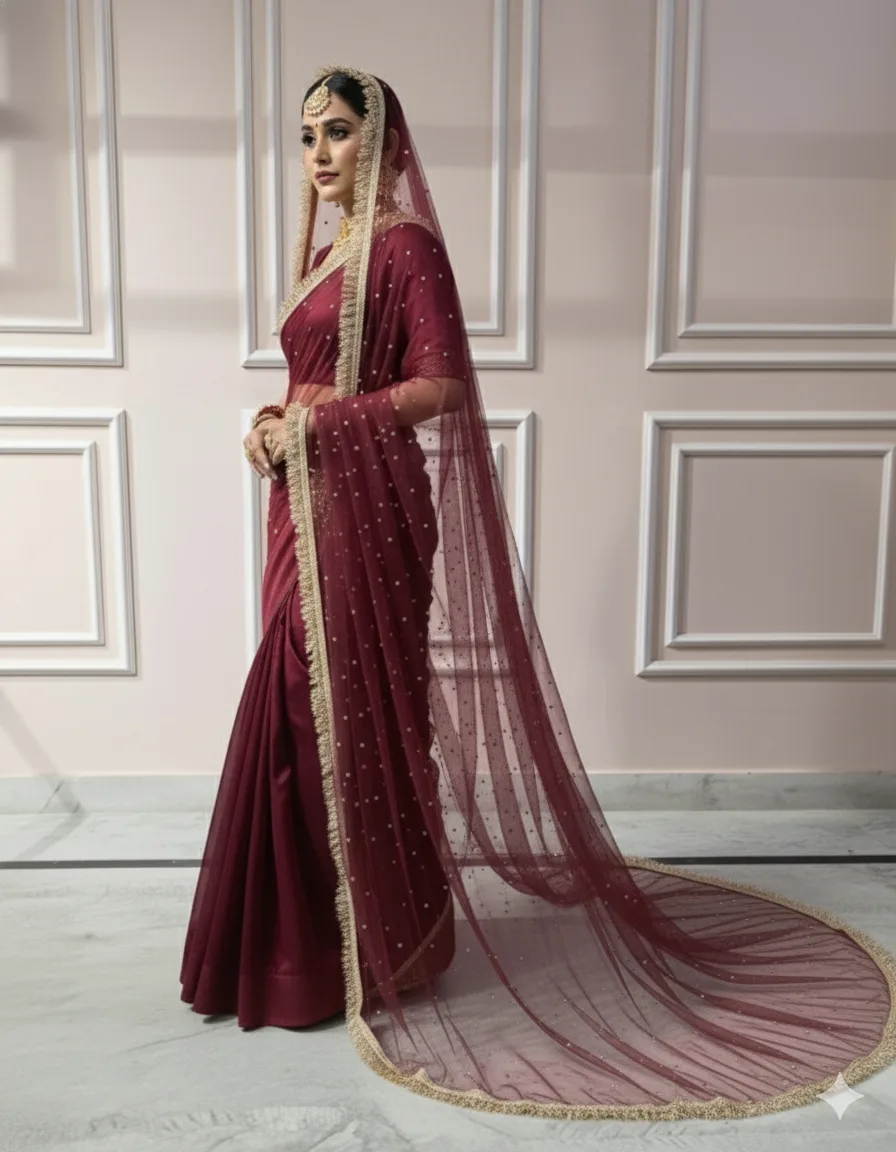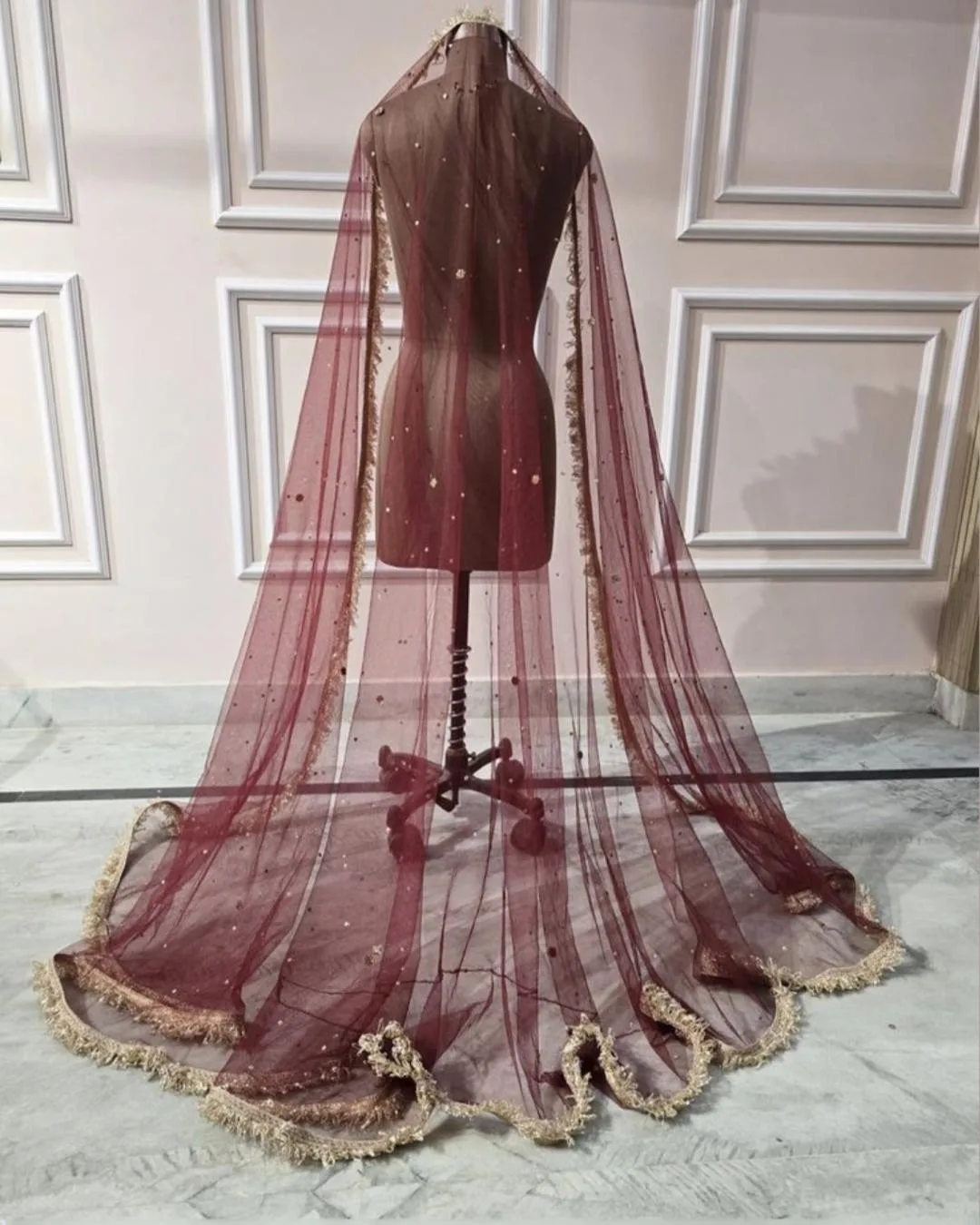 This maroon bridal veil is crafted for brides who love a regal and majestic look. The soft net fabric falls elegantly over the head and shoulders, while the golden sequins add a festive bridal glow. The opulent golden frill border makes it a standout piece for wedding rituals, sangeet nights, bridal entry shots or pairing with heavy lehengas.