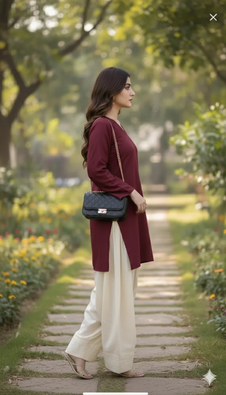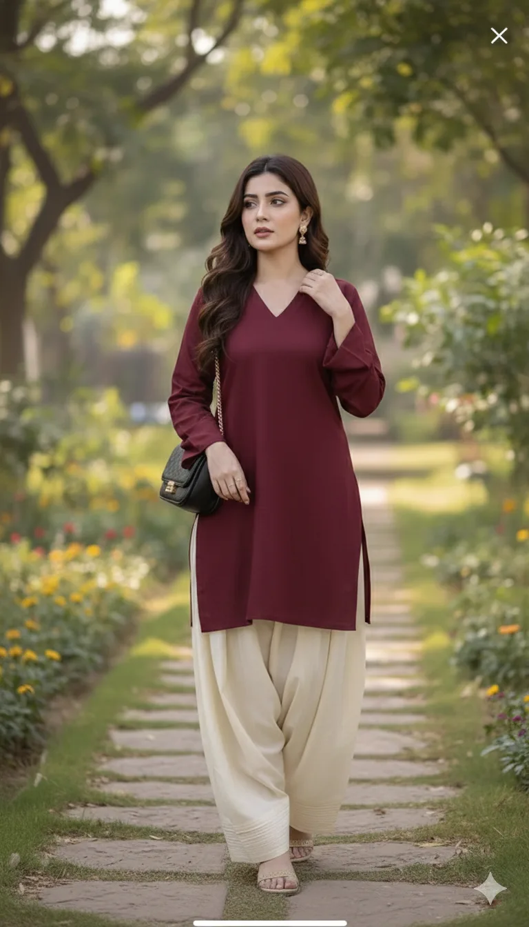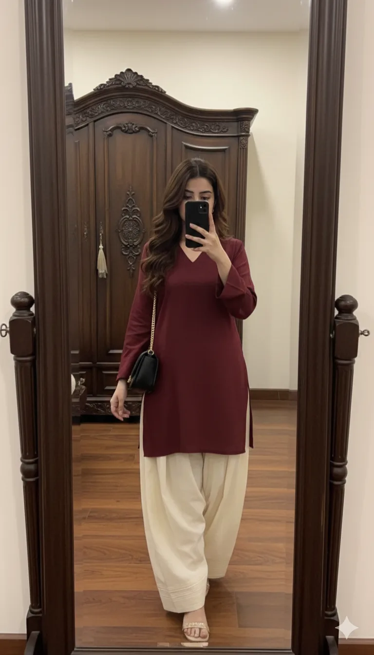 Set Includes: 1 Maroon Kurti (Top) & 1 Cream Farshi Salwar (Bottom).