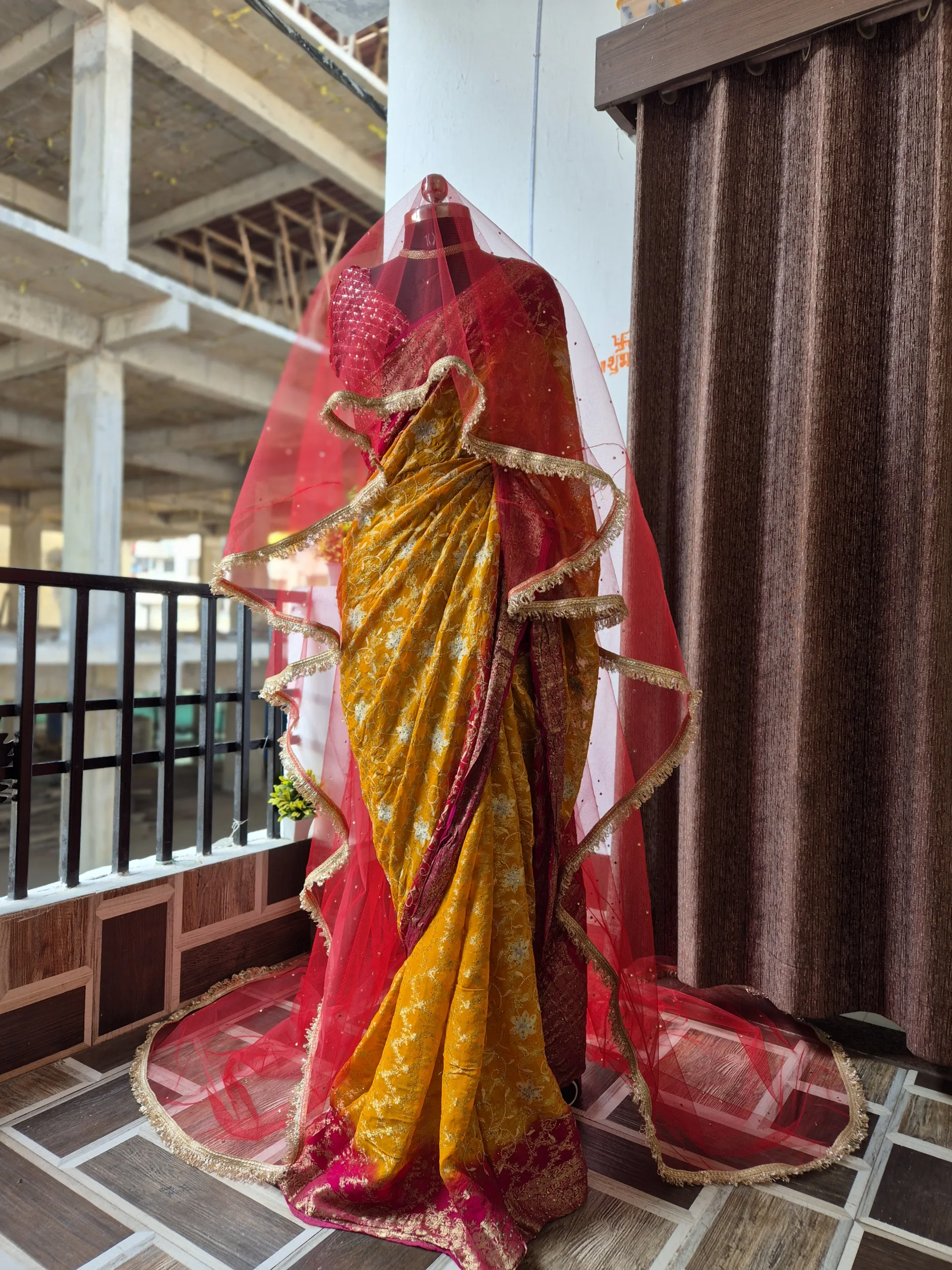 The veil features neat stone work that adds richness to the design, along with a finely finished gota lace border that enhances its traditional appeal. Its ghunghat-style drape allows the bride to cover her head beautifully, making it suitable for wedding pheras, bridal entry, and cultural ceremonies.