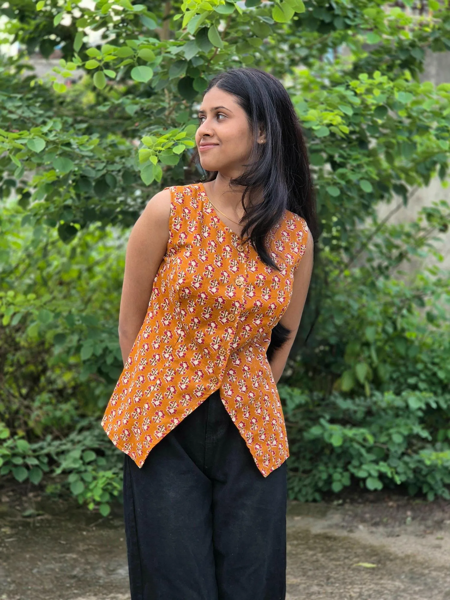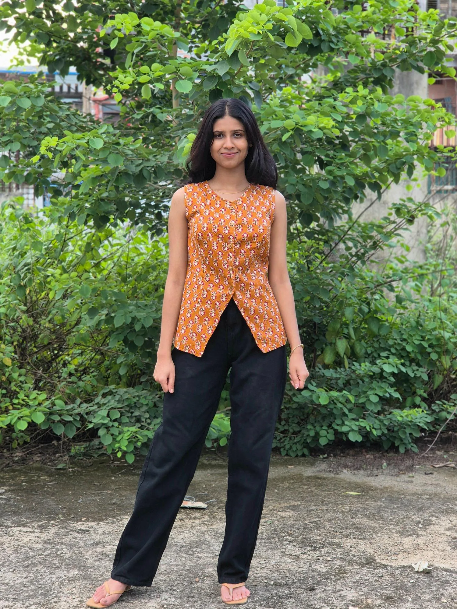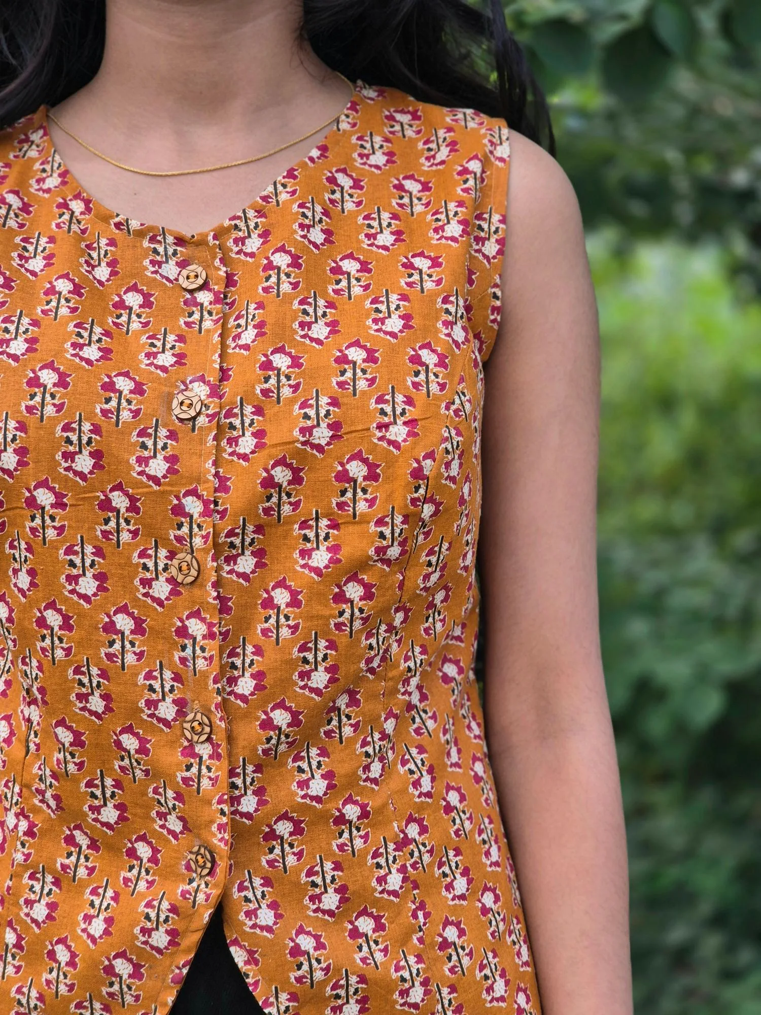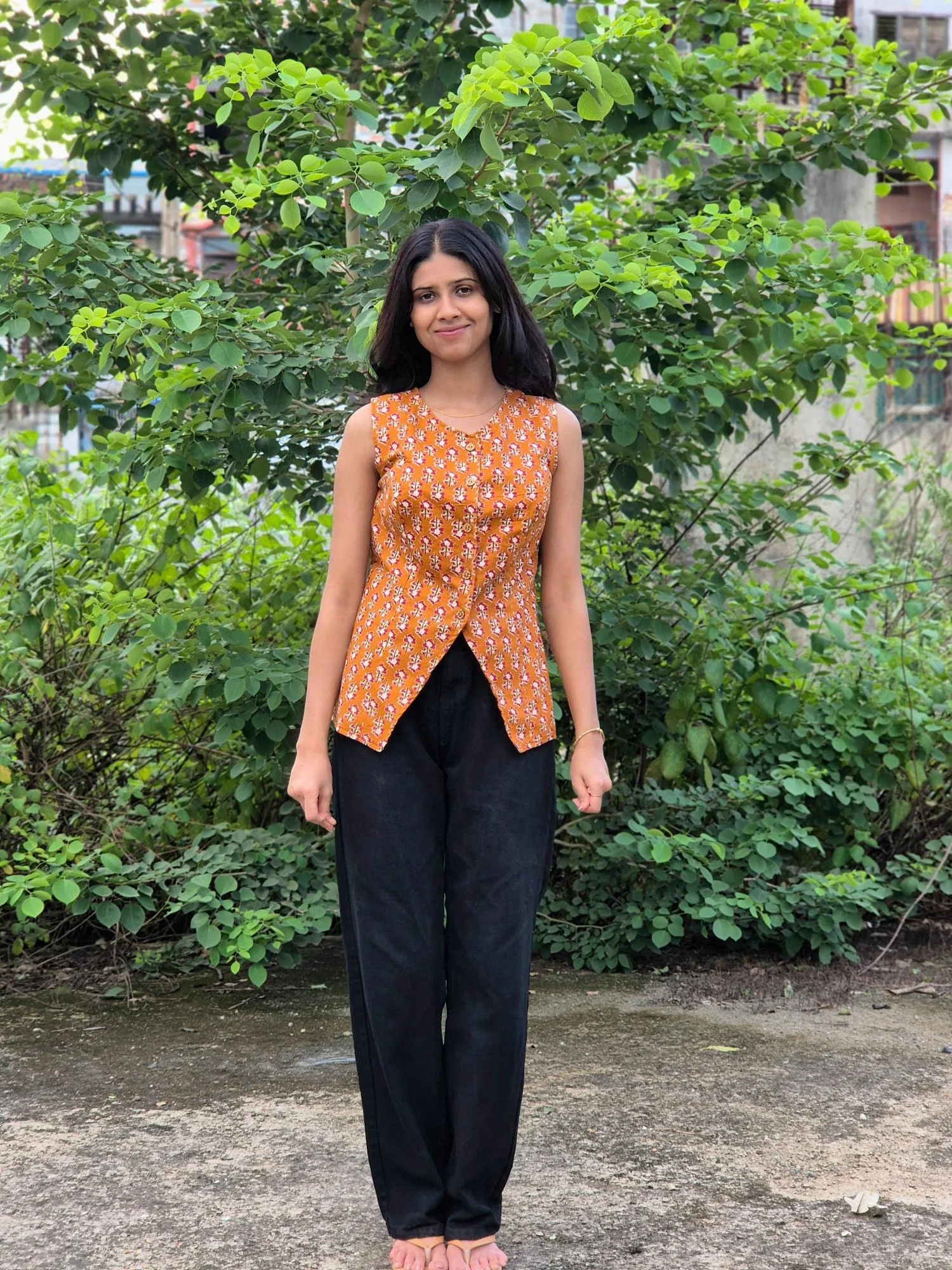 This unique waistcoat is a perfect fusion of ethnic and modern style. Handcrafted from pure cotton with Sanganer hand block printing, its comfortable sleeveless design adds an effortlessly chic touch to your everyday look. Pair it with jeans or trousers for a complete outfit.